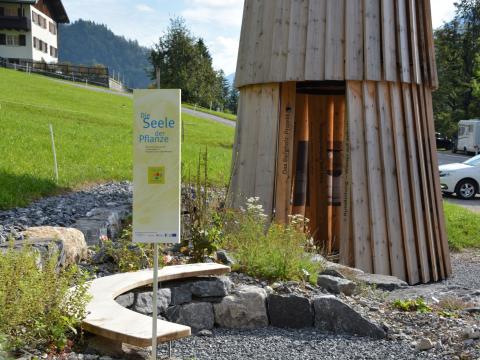 Während Veranstaltungen wie Pflanzentreffen, beim Verweilen auf der Bank und beim Besuch im Vorbeigehen lernen Interessierte im neuen Kräutergarten Wissenswertes über die Pflanzenvielfalt im Großen Walsertal. Foto: Biosphärenpark Großes Walsertal